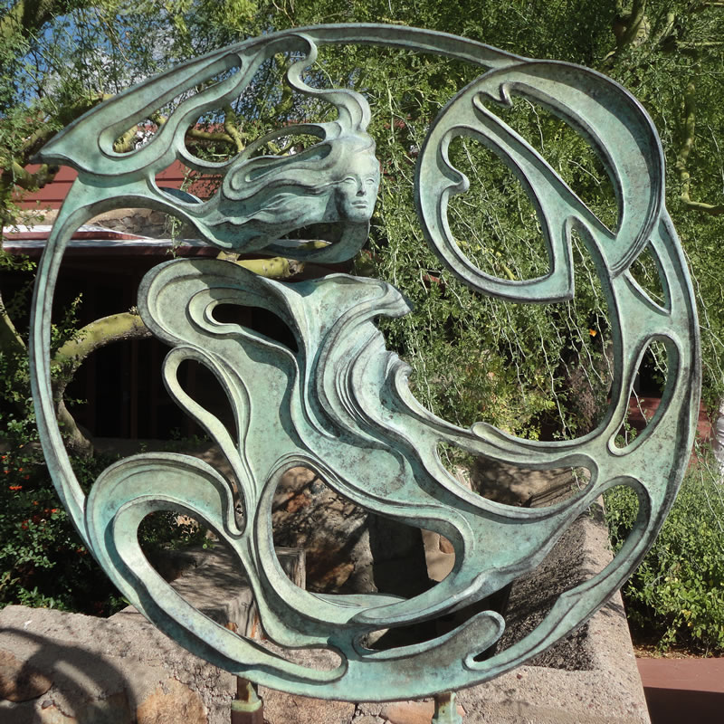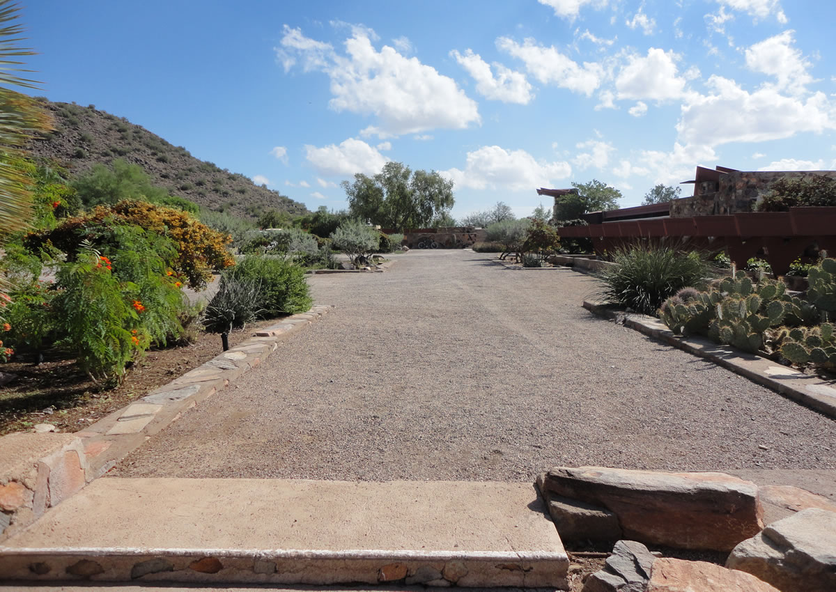 The main thing I found missing from Taliesin West was comfort. That may be my practical Midwestern roots showing but seriously where can you sit down and relax after a long day at work? Wright liked to challenge people’s perspectives by making some rooms short and tight and others large and open. This gave me an unsettled feeling. I can only imagine what it was like when first built with very few windows. It was just open to the elements. In addition, we saw dining tables that were too short to get your knees under, a bathroom the size of a closet and his bed which was actually two twin beds divided by a short wall. When the wind blew at night he would sleep behind the wall to stay out of the draft. Yes, really.