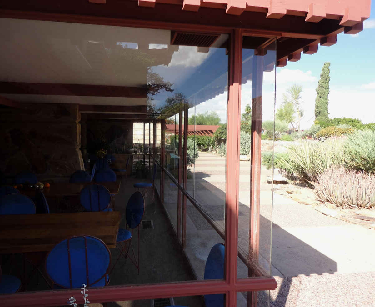 The first thing that struck me was the concrete. Ok, actually the first thing that struck me was the sticker shock of $36 per person for a 90 minute tour but the next thing was the concrete. Now that I have done a little research I do see that it was a common material for him but still, the concrete was very rough and didn’t feel finished. This is probably due to three reasons. First, he used a lot of rock and sand from the property. Second, the buildings were put together by architectural apprentices, not craftsman. And third, Wright was bad with money and probably didn’t have much to spend. In many ways Taliesin West was an experiment in style and construction and it shows it.