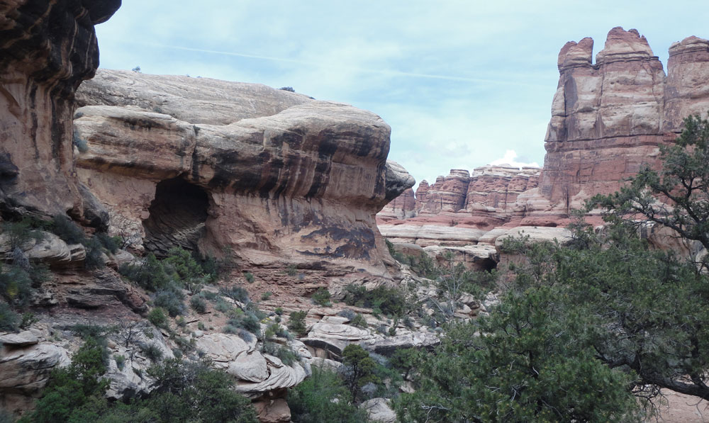 To be fair, it isn’t easy. The distance is 11 miles round trip. The route to the arch takes you in and out of canyons, down sandy washes, up steep banks, over slickrock pour-overs and, just before reaching the arch, up a steep slope of loose sand and rocks. Add to that the facts that you have to haul all the water you need and the temperature can swing up to 40f throughout the day. So, a nice temperature of 60f degrees in the morning can turn into a 90f to 100f degree day by late afternoon with your water supply fading fast.